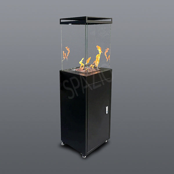 Firepit with metal body and tempered glass cover. Includes: Regulator, control knob, air mixer and safety backup valve. For use with 9Kg LP gas cylinders